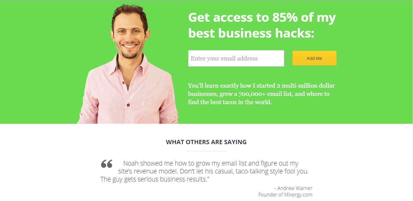 Principle 1 (reciprocity) – Website visitors are offered something for free (access to 85% of Noah’s best business hacks) in return for a small favour (their email address).