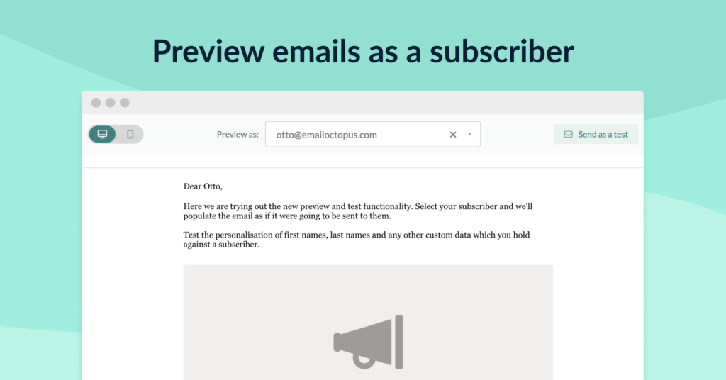 Nothing scares an email marketer more than hitting that send button. It’s important you have confidence in your email displaying the right information without typos, design troubles or embarrassing {{FirstName}} issues. We’ve overhauled our Preview and Send a Test features, combining them into one to allow you to preview emails as if you were a subscriber to your list.
