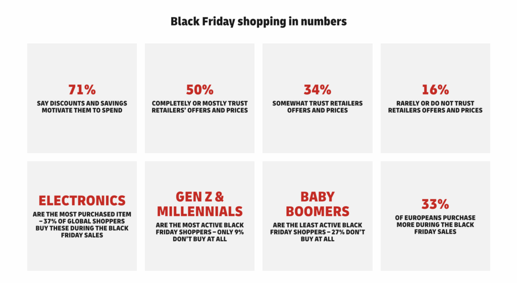 A report by DHL says that 75% of global shoppers make a purchase during Black Friday and Cyber Monday. Also, 71% of these shoppers have said that discounts and saving motivate them to spend.