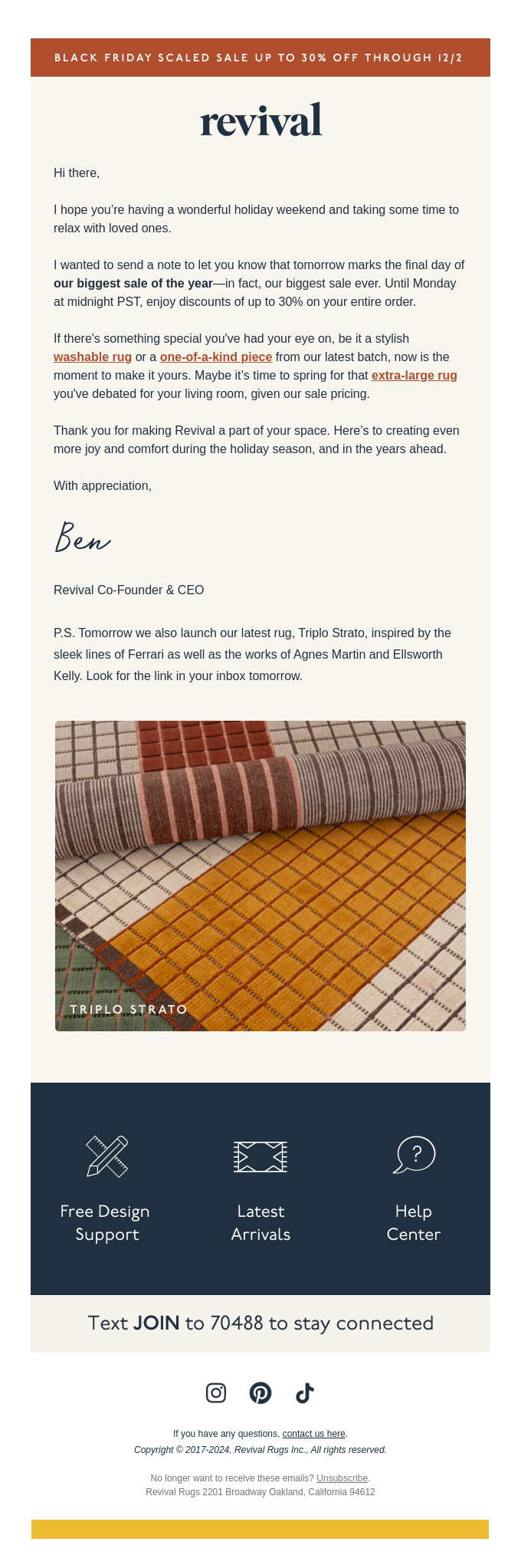 This email is a perfect example of the “less is more” approach. Without any flashy features, it focuses on delivering a clear, impactful message: the biggest sale of the year. It covers all the essentials while maintaining simplicity and effectiveness. Many subscribers respond better to clean, straightforward designs, so it’s important to understand your audience and test what resonates most with them. Remember, a simple email that gets the message across is always better than no communication at all.