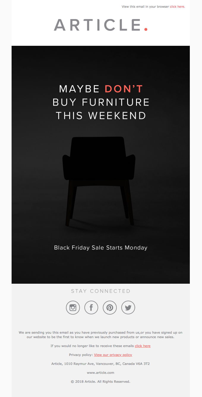 This email by Article takes a similar approach to Flings, but instead of making people start purchasing right away with an early sale, they make them wait until the beginning of next week.