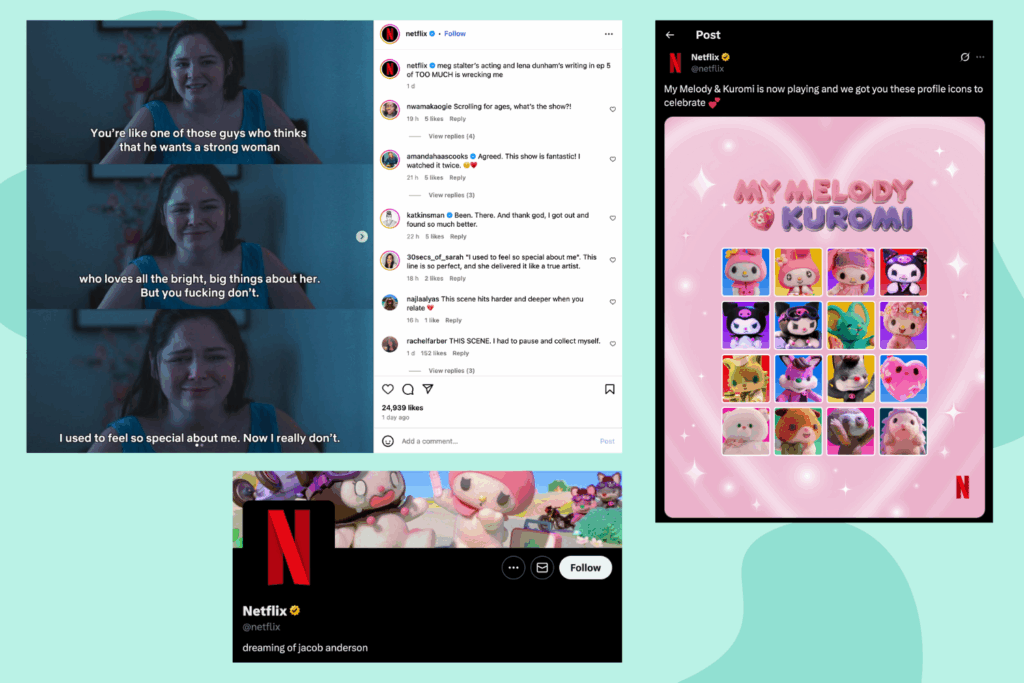 Netflix’s tone is friendly and feels like chatting with a friend who always has a good show to suggest. It’s welcoming, excited, and aims to connect with people of all ages around the world. Their social media is full of things like memes that help continue this same friendly style of communication.