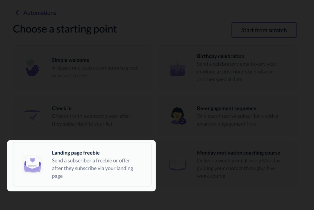 To set up a landing page freebie automation, simply go to our automation creation page and click on the tab that says, “Landing page freebie”.