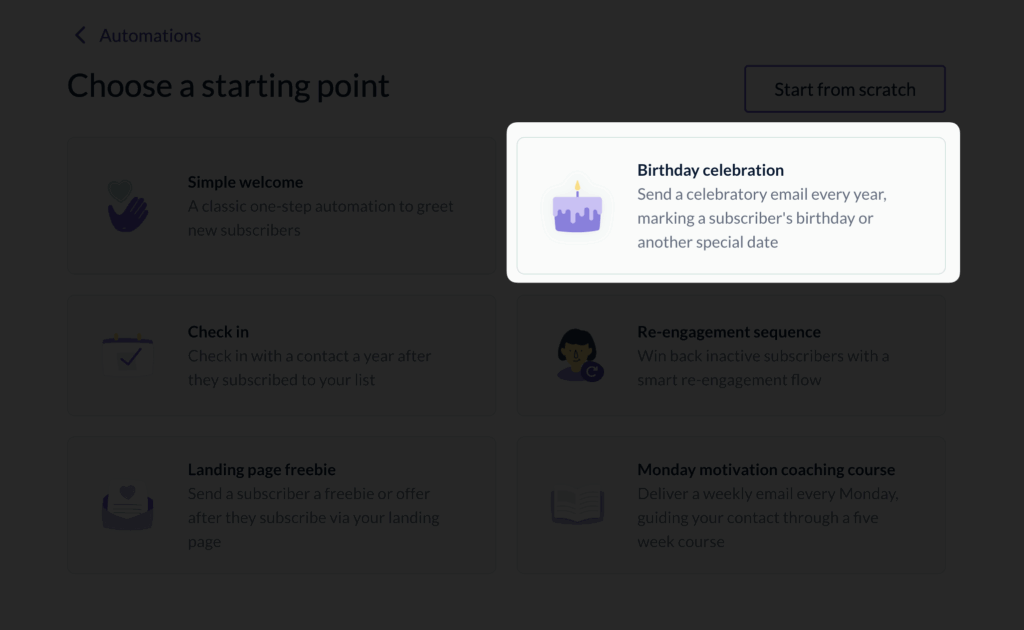 To set up a landing page freebie automation, simply go to our automation creation page and click on the tab that says, “Birthday celebration”.