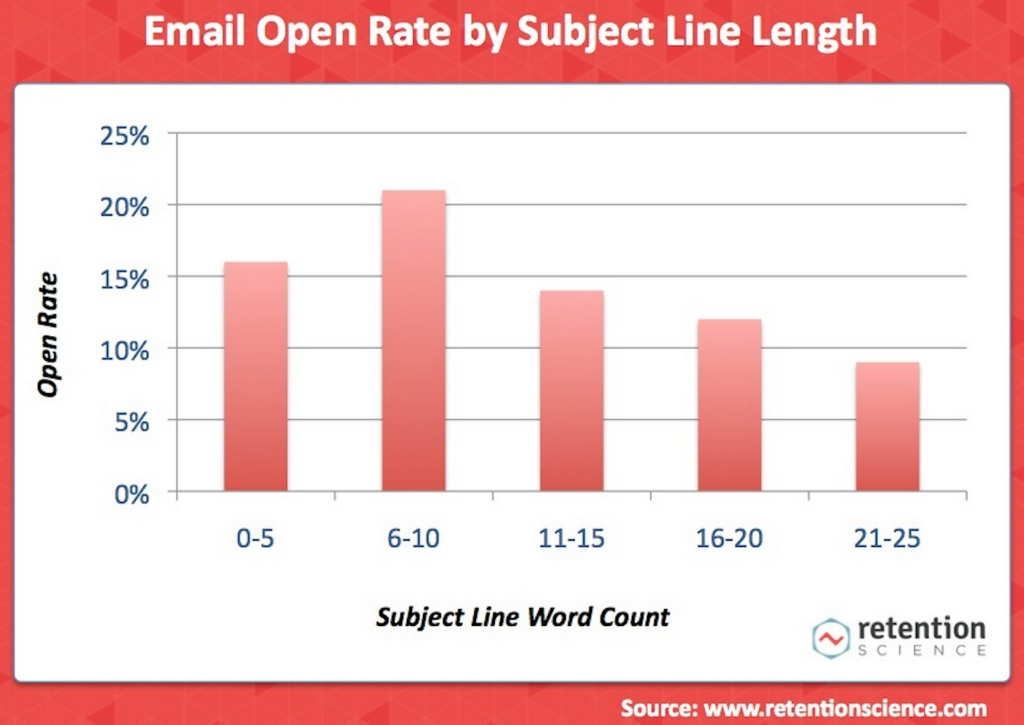 Back in 2014 Retention Science analysed 260 millions emails and found those with subject lines just 6 to 10 words in length generated higher open rates.