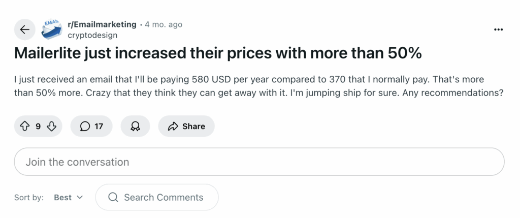 MailerLite was known for its ease of use and affordable pricing, however like all other email marketing tools they’ve also decided to raise their pricing in 2024. Some people even reported the increase for their accounts to be more than 50% which is a significant jump and not every business can afford it.