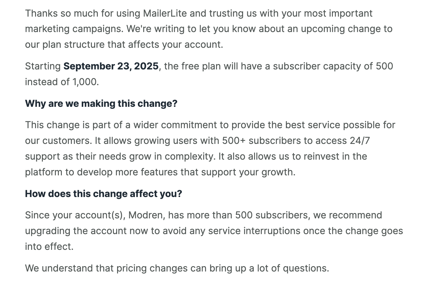 The latest update to MailerLite’s pricing model is a reduced limit on their free plan.