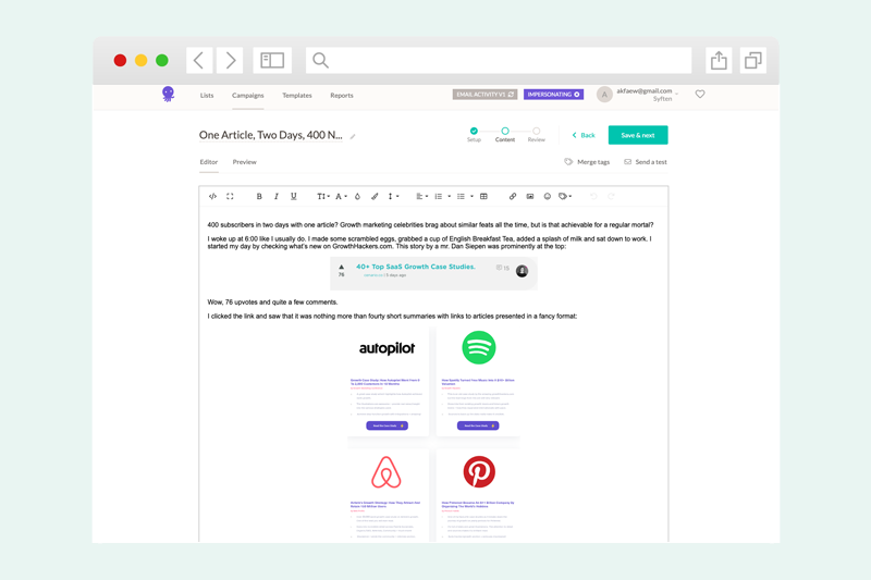 I tried Mailchimp and ConvertKit. I felt they’re designed for non-technical people, and won’t let technical people do what they want. Also the support was abysmal (nothing more frustrating than receiving a canned response). Thank you Magdalena from EmailOctopus support for being a human!